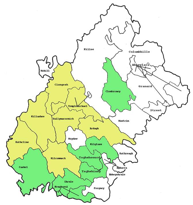 Text Box: A map of the Civil Parishes of County Longford. The parishes with Dennigans (or variants of the name) are in yellow. The parishes with Donegans or variants of that name are in green. Where a parish has both Dennigans and Donegans it is marked yellow.