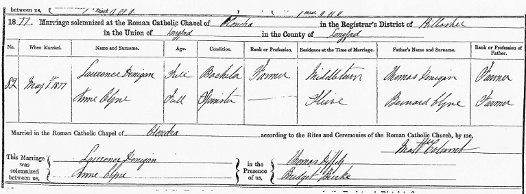 Text Box: Marriage of Laurence Dennigan and Anne Clyne, 1877